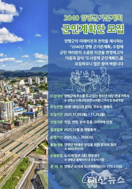 태산뉴스 이동욱 기자 | 양평군은 3일부터 24일까지 미래 양평의 청사진을 그릴 ‘2040년 양평 군기본계획’ 수립을 위해 군민과 함께하는 ‘도시정책 군민계획단’을 모집한다고 밝혔다.