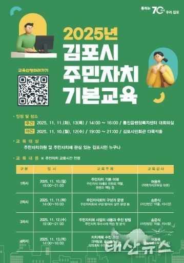 태산뉴스 이동욱 기자 | 김포시는 주민자치위원 및 주민자치에 관심 있는 시민을 대상으로 '2025년 김포시 주민자치 기본 교육'을 오는 11월 10일부터 13일까지 운영한다고 밝혔다.