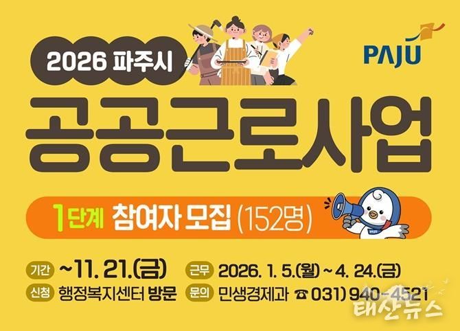 태산뉴스 이동욱 기자 | 파주시는 오는 21일까지 2026년 1단계 공공근로사업 참여자 152명을 모집한다고 밝혔다.
