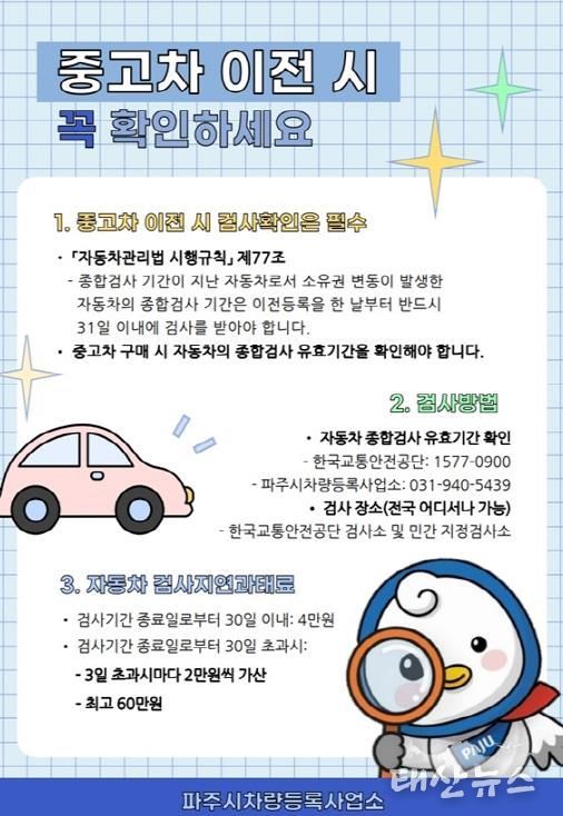 태산뉴스 이동욱 기자 | 파주시는 중고차 이전등록 시 종합검사 의무를 알지 못해 과태료가 부과되는 사례를 예방하기 위해, 취득세 납부 단계에서 ‵종합검사 의무 이행 안내문′을 함께 제공해 시민들이 기한 내 검사를 받을 수 있도록 적극 홍보할 계획이라고 밝혔다.