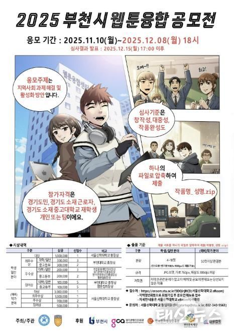 태산뉴스 이동욱 기자 | 부천시는 11월 10일부터 12월 8일까지 서울신학대학교 ‘이룸(eRoom)’ 플랫폼을 통해 지역 웹툰 창작 생태계를 조성하고 차세대 창의인재를 발굴하기 위한 ‘2025 부천시 웹툰융합공모전’을 개최한다.