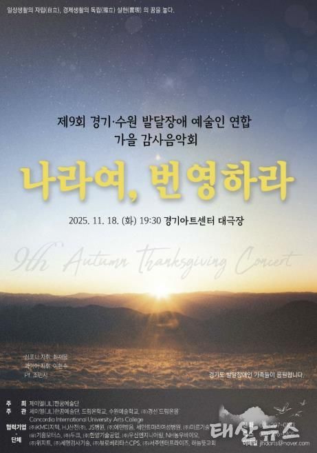 태산뉴스 이동욱 기자 | “나라여, 번영하라”, 우리나라의 안정과 번영을 기원하는 뜻으로 2025년 11월 18일 19시 30분, 경기아트센터 대극장에서 경기.수원 발달장애 예술인들이 연합으로 제9회 가을 감사음악회를 개최한다.