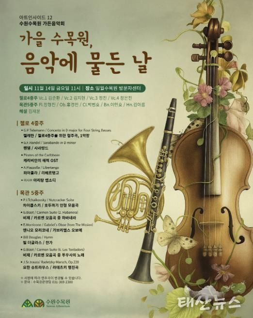 태산뉴스 이동욱 기자 | 수원특례시가 14일 오전 11시 일월수목원 방문자센터 물빛누리홀에서 ‘가을 수목원, 음악에 물든 날’ 가든 음악회를 연다.