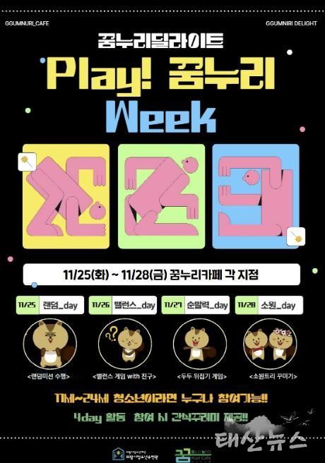 태산뉴스 이동욱 기자 | 의왕시청소년재단 산하 의왕시청소년수련관 꿈누리카페(▲고천점( 문화공원로 33), ▲내손점(복지로 109), ▲오전점(찬우물길 11), ▲백운밸리점(백운중앙로 74, 총 4개 지점))는 오는 11월 25일부터 28일까지 4일간 꿈누리딜라이트 『Play! 꿈누리 Week』를 진행한다고 밝혔다.