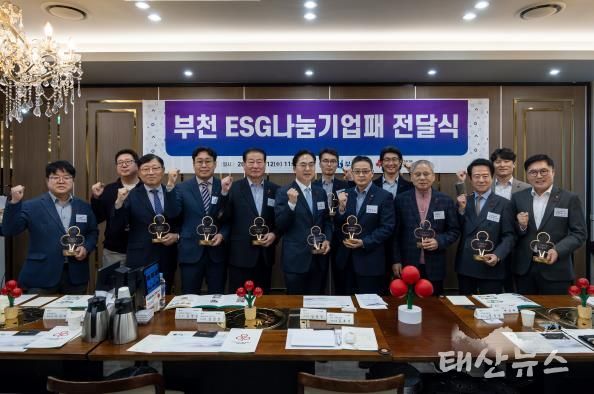 태산뉴스 이동욱 기자 | 부천시는 지난 12일 경기사회복지공동모금회와 함께 ‘부천ESG 나눔기업패’ 전달식과 오찬 간담회를 열었다. 이날 행사에는 남동경 부시장, 김효진 경기사회복지공동모금회 사무처장, 부천ESG 나눔기업 11곳의 대표 등이 참석했다.
