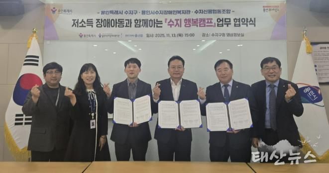 태산뉴스 이동욱 기자 | 용인특례시 수지구는 13일 용인시수지장애인복지관과 수지신용협동조합과 함께 저소득 장애아동의 복지 향상과 장애 인식 개선을 위한 ‘수지 행복캠프’ 추진 업무협약을 체결했다고 14일 밝혔다.