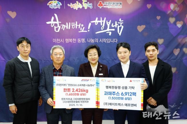 태산뉴스 이동욱 기자 | 이천시는 11월 13일 시청에서 지역 사회를 위한 따뜻한 나눔이 이어졌다고 밝혔다. 이날 기탁식에는 (사)대한한돈협회 이천지부와 ㈜에이트랙스 애프앤비가 참여해 이웃사랑 실천에 동참했다.