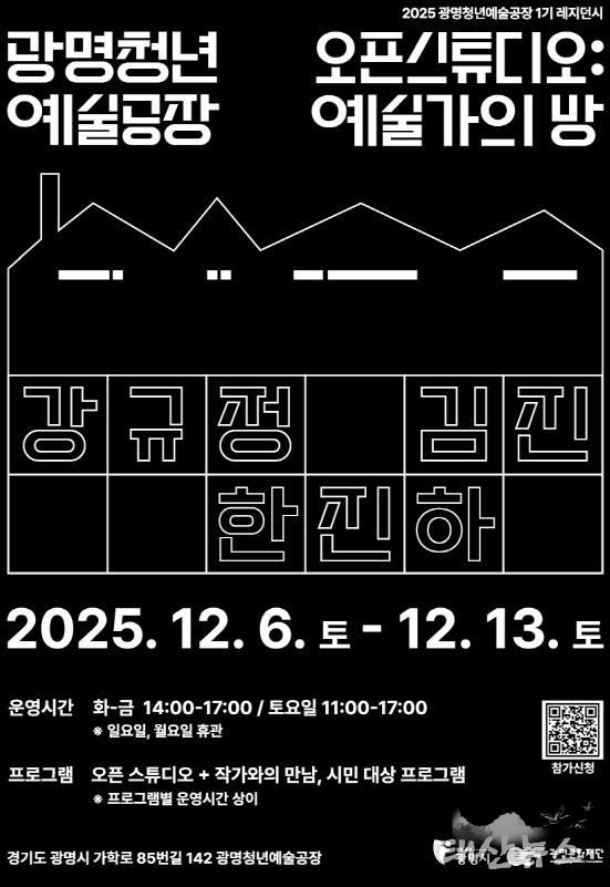 태산뉴스 이동욱 기자 | 광명문화재단은 오는 12월 6일부터 13일까지 청년 예술인 레지던시 공간인 광명청년예술공장에서 입주 작가 오픈스튜디오 '예술가의 방'을 개최한다.