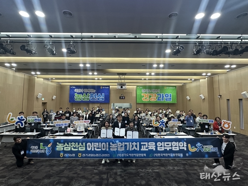 태산뉴스 이월금 기자 | 농협경기본부(본부장 엄범식), 경기도어린이집연합회(회장 장경임)와 한국어린이집총연합회(회장 김경숙)는 18일 농협제주수련원에서 연합회 임원 100여명과 함께「농심천심 어린이 농업가치 교육 업무협약」을 체결했다고 밝혔다.
