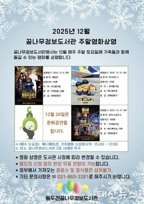 태산뉴스 이동욱 기자 | 동두천시 도서문화사업소 꿈나무정보도서관은 12월 매주 토요일 어린이와 가족을 위한 애니메이션 및 가족영화 3편을 상영한다고 밝혔다.