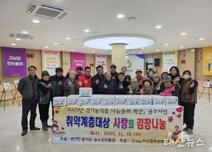 태산뉴스 이동욱 기자 | 가남읍주민자치회는 11월 18일에서 19일 이틀간 가남읍 행복나눔센터 1층에서 ‘취약계층대상 사랑의 김장나눔’봉사를 개최했다. 이번 행사는 '2025년 경기농식품 나눔문화 확산' 공모사업의 일환으로 진행됐으며, 정성스럽게 담근 김장김치와 알타리김치를 관내 40개 마을의 홀몸어르신 80명에게 전달했다.