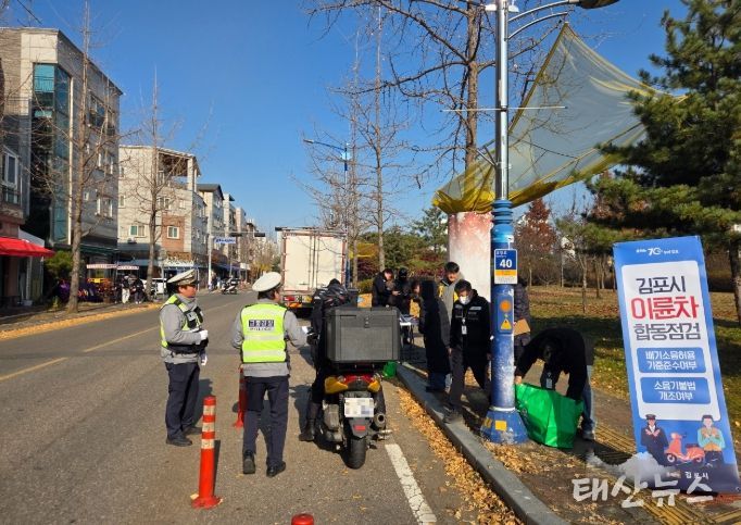 태산뉴스 이동욱 기자 | 김포시는 12월 19일 오후 2시부터 4까지 장기동 먹자골목 인근에서 이륜자동차를 대상으로 유관기관 합동점검을 실시했다고 밝혔다. 이번 점검은 코로나19 이후 급증한 배달문화 확산으로 증가한 이륜자동차 소음 민원에 적극적인 대응을 하고자 진행됐다.