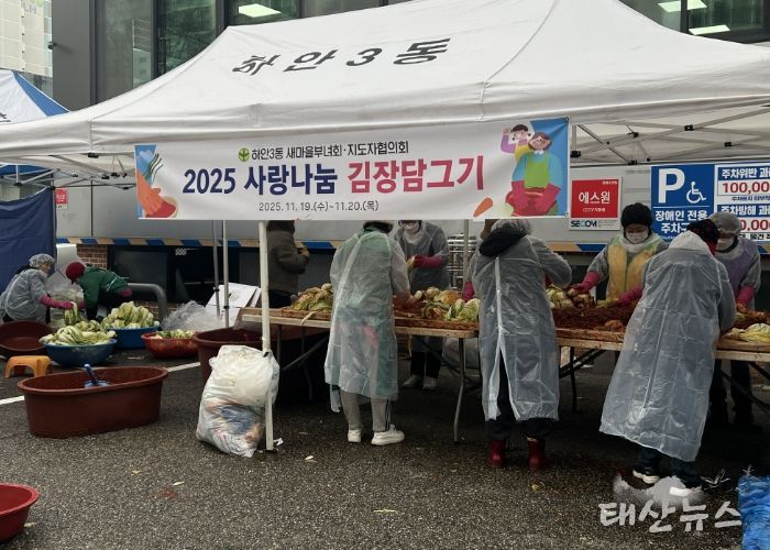 태산뉴스 이동욱 기자 | 광명시 하안3동 새마을부녀회와 새마을지도자협의회는 지난 19일부터 20일까지 이틀간 하안3동 행정복지센터 앞 주차장에서 ‘사랑나눔 김장 담그기’ 행사를 열었다.