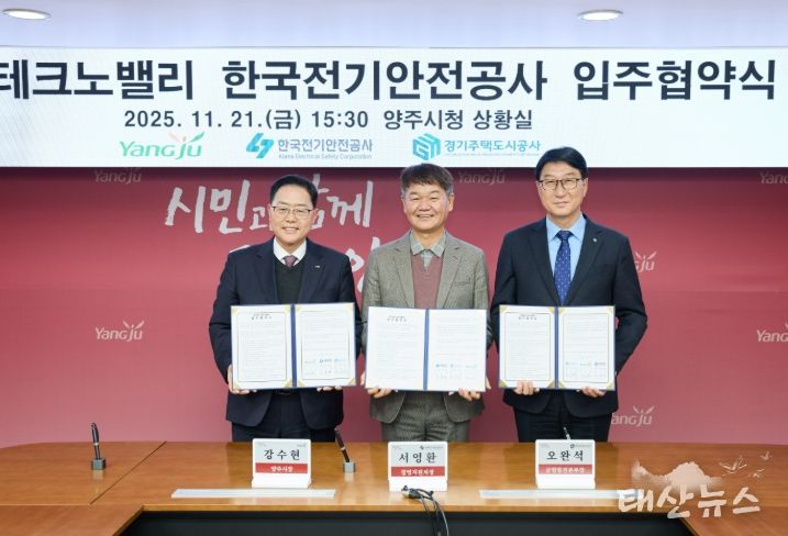태산뉴스 김준수 기자 | 경기주택도시공사(GH)는 21일 양주시청 상황실에서 양주시, 한국전기안전공사와 함께 ‘한국전기안전공사 북부지역본부’의 경기양주 테크노밸리 입주를 위한 협약식을 체결했다고 밝혔다.