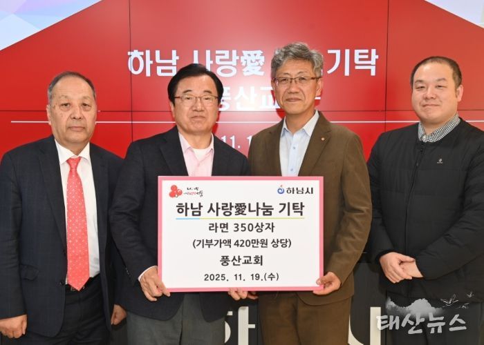 태산뉴스 이동욱 기자 | 지난 19일, 미사3동 소재 풍산교회는 하남시에 라면 350박스(420만원 상당)을 기부하며 기탁식을 가졌다.