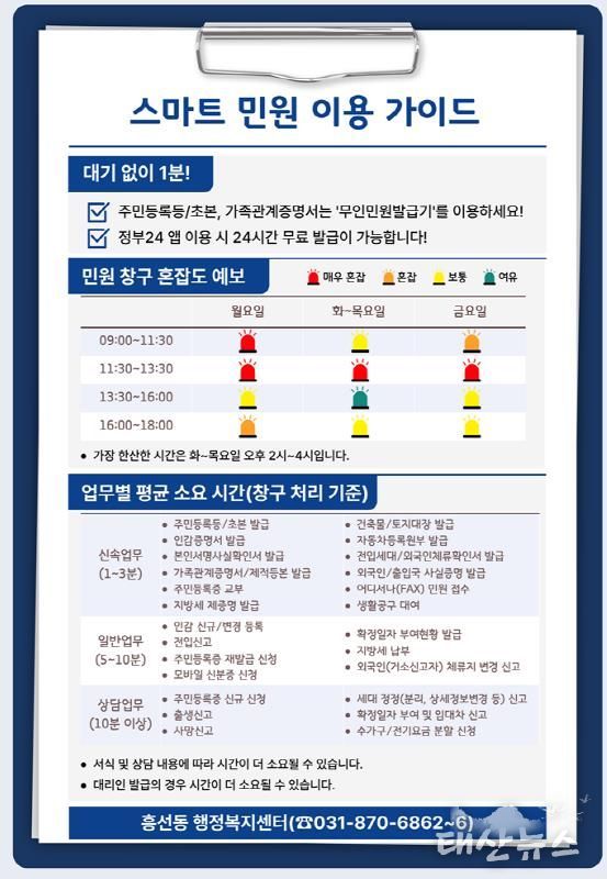 태산뉴스 이동욱 기자 | 의정부시 흥선동행정복지센터는 민원인이 대기 중에 겪는 심리적 불안감과 불편을 해소하고, 행정서비스의 예측 가능성을 높이기 위해 ‘민원 대기시간 투명 예보제’를 시행한다.