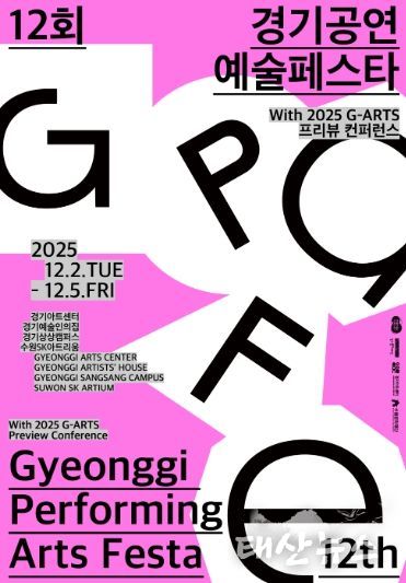 태산뉴스 김준수 기자 | 경기문화재단은 경기도 수원 일대에서 제12회 경기공연예술페스타를 개최한다. 페스타는 2025년 12월 2일부터 5일까지 경기 예술인의 집, 경기아트센터, 경기상상캠퍼스, 수원SK아트리움 등에서 진행되며, 베스트콜렉션, 쇼케이스 데이, 공동 창·제작 쇼케이스, 피치세션, 토크세션, 워크숍 등 다양한 프로그램을 통해 경기 공연예술 생태계의 흐름과 성과를 한눈에 보여줄 예정이다. 또한 경기아트센터 주최 ‘2025 G-ARTS 프리뷰 컨퍼런스’가 동시 개최되며, 보다 풍성한 전문 교류의 장을 마련한다.