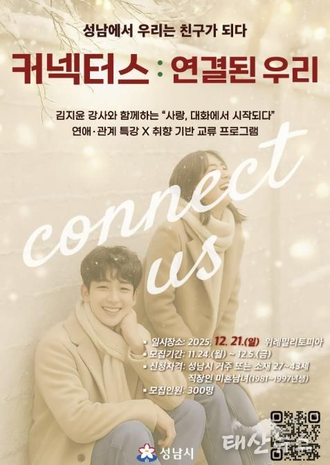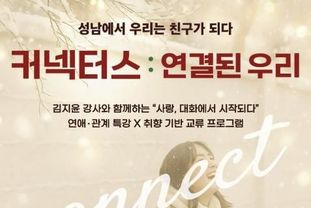 태산뉴스 이동욱 기자 | 성남시는 새로운 친구를 만들 수 있는 청년 교류 행사 ‘커넥터스(Connect-us) 연결된 우리’ 참가 희망자 300명을 오는 12월 5일까지 모집한다.