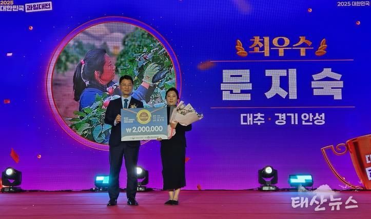 태산뉴스 이동욱 기자 | 농림축산식품부 주최, 한국과수농협연합회 주관으로 하는 ‘2025 대한민국 과일산업대전 대표과일선발대회’에서 안성시가 2023년부터 대추부문에서 최우수상, 우수상을 수상하여 3년 연속 대추부문 최고자리에 올랐다. 수상자로 문지숙 대표가 최우수상(농림축산식품부장관상)으로 선정됐고, 조재곤 대표가 우수상(산림청장상)으로 선정됐다.