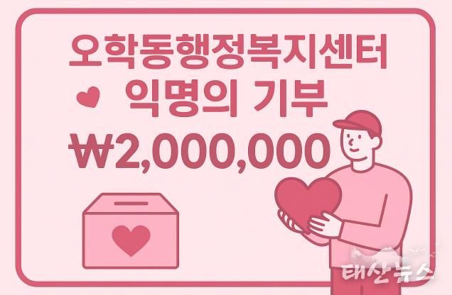 태산뉴스 이동욱 기자 | 오학동은 지난 11월 27일 익명 기부자가 후원한 200만원을 지역 사회의 취약계층을 지원하는 데 사용할 예정이라고 밝혔다. 기부자에 대한 정보는 공개되지 않았지만, 기부자의 따뜻한 마음은 오학동 주민들에게 큰 힘이 될 것이다.