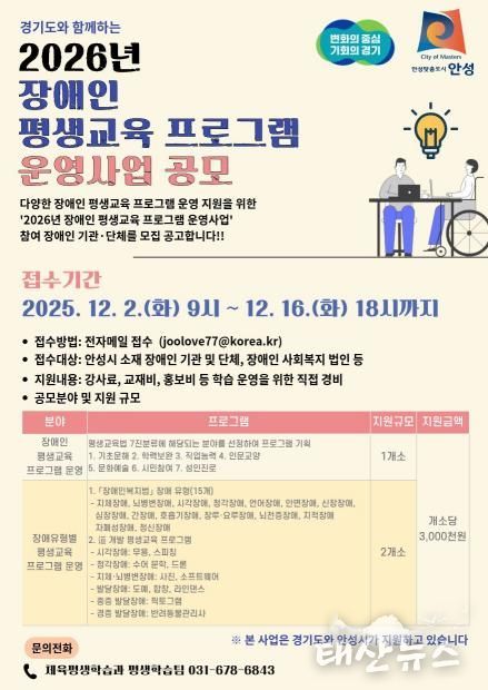 신청 대상은 안성시에 주소(등록)를 둔 장애인 평생교육 기관‧단체이며, 신청 기간은 12월 2일부터 16일까지이다. 모집 규모는 ▲평생교육법 제7진 분류를 기반으로 한 ‘장애인 평생교육 프로그램’ 1개소와 ▲'장애인복지법'에 따른 15개 장애 유형 분류를 기반으로 한 ‘장애유형별 평생교육 프로그램’ 2개소, 총 3개소이다. 선정된 프로그램은 2026년 2월부터 10월까지 운영될 예정이다.