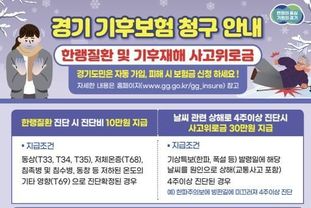 경기 기후보험은 경기도가 보험료 전액을 부담해 도민 누구나 별도의 절차 없이 자동 가입되며, ▲온열질환·한랭질환 진단비 ▲감염병 진단비 ▲기상특보 관련 4주 이상 상해 시 사고위로금 등을 정액 보장한다.
