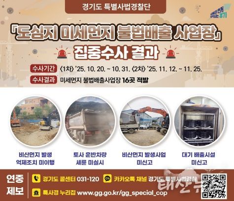 태산뉴스 김준수 기자 | 경기도는 도심지 미세먼지 발생사업장 330개를 대상으로 불법 배출 행위를 집중 수사해 대기환경보전법 위반 사업장 16개를 적발했다고 9일 밝혔다.