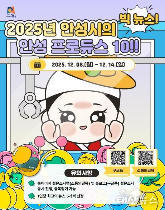 시 관계자는 “2025년 안성이 이뤄낸 의미 있는 변화들은 시민 여러분의 관심과 성원이 있었기에 가능했다”며 “한 해를 마무리하는 시점에 시민분들이 생각하는 ‘올해 안성의 대표 뉴스’ 선정에 많은 참여를 부탁드린다”고 밝혔다.