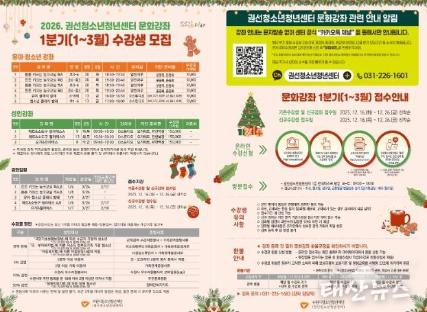 태산뉴스 이동욱 기자 | 수원시청소년청년재단 권선청소년청년센터는 오는 1월 6일부터 3월 27일까지 지역사회 평생학습 문화강좌 1분기(1~3월) 수강생을 모집한다.