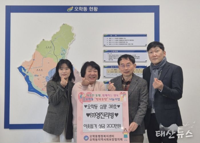 이에 오학동 김병선 동장은 “매년 변함없이 이웃사랑을 실천해 주시는 (주)영진리빙에 깊은 감사의 말씀을 드린다”며 “기탁해 주신 성금은 도움이 필요한 이웃들에게 소중히 전달하여 따뜻한 지역사회를 만드는 데 사용하겠다”고 말했다.