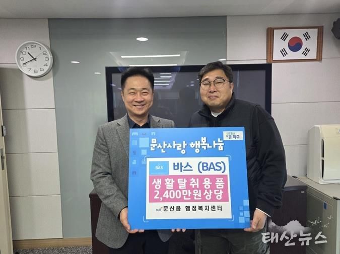먼저, 생활용품 제조기업 바스(BAS)는 18일 섬유탈취제, 곰팡이 제거제, 과일·야채 세정제 등 2,400만 원 상당의 생활용품을 문산읍에 기탁했다. 이번 기부 물품은 위생 환경 개선이 필요한 취약 가구와 복지 사각지대 가구에 전달될 예정이다.