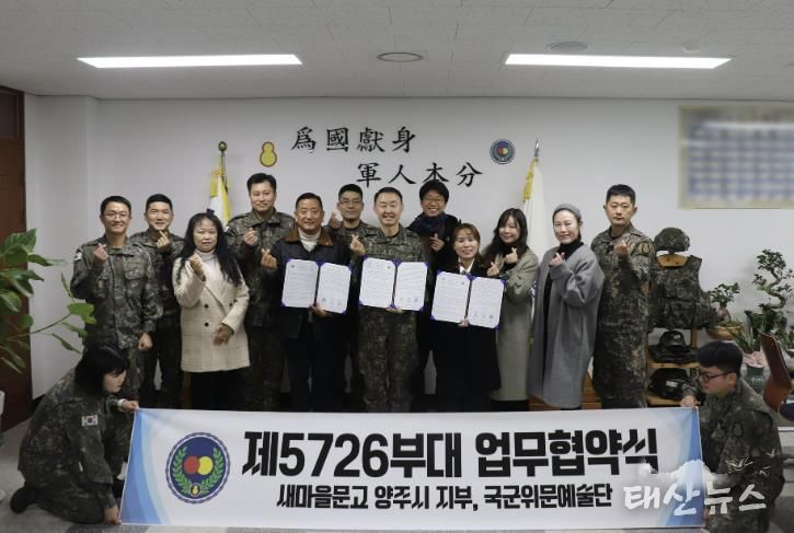 태산뉴스 이동욱 기자 | 새마을문고 양주시지부는 지난 12월 19일, 육군 제5726부대에서 군 장병들의 독서문화 확산과 인문학적 소양 증진을 위한 업무협약(MOU)을 체결했다고 밝혔다.