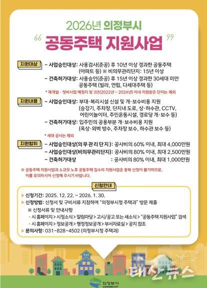 태산뉴스 이동욱 기자 | 의정부시는 노후 공동주택의 관리비용 부담 완화와 주거환경 개선을 위해 내년 1월 30일까지 ‘2026년 공동주택 지원사업’ 신청을 받는다.