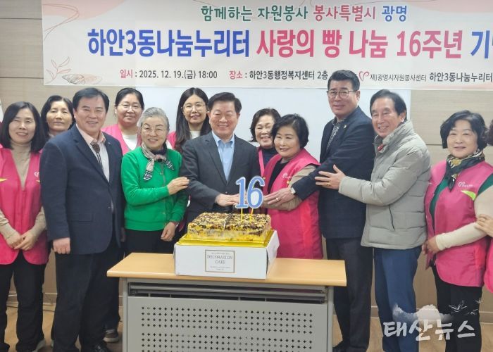 태산뉴스 이동욱 기자 | 광명시 하안3동 나눔누리터는 광명시자원봉사센터, 하안3동 행정복지센터와 함께 지난 19일 하안3동 행정복지센터 2층 회의실에서 ‘사랑의 빵 나눔’ 16주년 기념식을 개최했다.