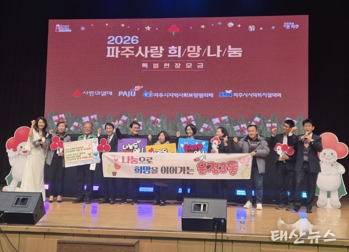 태산뉴스 이동욱 기자 | 파주시 운정3동 주요 사회단체들은 지난 19일, 파주시민회관 대공연장에서 개최된 ‘2026 파주사랑 희망나눔 특별현장모금’에 참여해 성금과 물품을 전달하며 연말을 맞아 따뜻한 나눔을 실천했다.