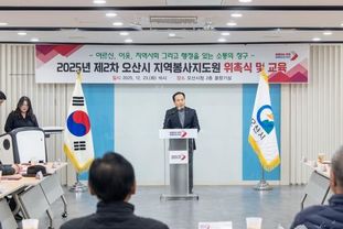 태산뉴스 이동욱 기자 | 오산시는 지난 23일 오산시청 물향기실에서 신규 경로당 회장을 대상으로 한 '2025년 지역봉사지도원 위촉식'을 개최했다고 밝혔다.