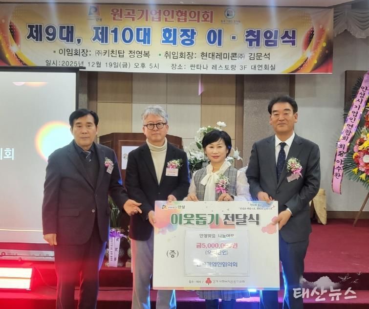태산뉴스 이동욱 기자 | 안성시 원곡면 지역 기업들의 모임인 원곡기업인협의회는 지난 12월 19일 제9대, 제10대 이·취임식에서 이웃돕기 성금 500만원을 원곡면에 기탁했다.