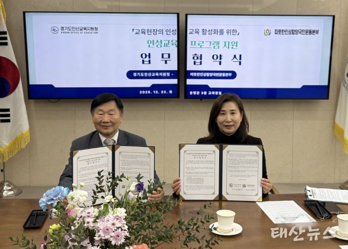 태산뉴스 김준수 기자 | 경기도안산교육지원청은 12월 23일 오후 3시 30분, 따뜻한인성함양국민운동본부와 학교 현장의 인성교육 강화와 도덕성 회복을 위한 지역 연계형 인성교육 지원 체계 구축을 위한 업무협약(MOU)을 체결했다.