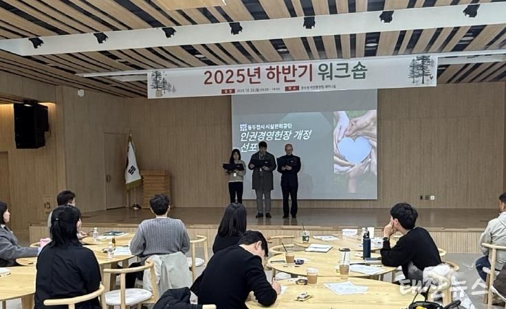 태산뉴스 이동욱 기자 | 동두천시 시설관리공단은 지난 22일 동두천 자연휴양림 세미나실에서 열린 2025년 하반기 워크숍에서 인권경영 헌장 개정 및 선포식을 개최했다고 밝혔다.