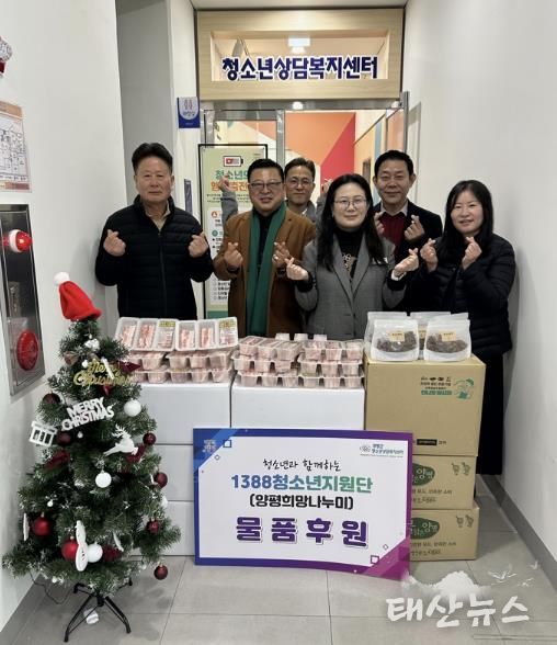 태산뉴스 이동욱 기자 | 양평군청소년상담복지센터는 지난 24일 1388청소년지원단으로부터 위기청소년을 위한 후원물품을 전달받았다고 밝혔다. 이날 전달식에는 임청우 단장과 양평 목우촌 문현길 대표가 참석해 돼지고기와 둥굴레차 세트 70개를 양평군청소년상담복지센터와 양평군학교밖청소년지원센터에 기부했다.