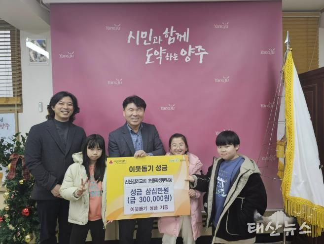 태산뉴스 이동욱 기자 | 양주시 남면 신산감리교회 초등부 4학년반 학생들은 지난 23일 남면 행정복지센터를 방문해 이웃돕기 성금을 전달하며 이웃사랑 실천에 앞장섰다.