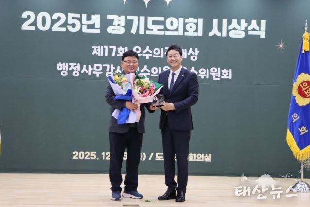 태산뉴스 김준수 기자 | 경기도의회 교육기획위원회 이택수 의원(국민의힘, 고양8)과 성기황 의원(더불어민주당, 군포2)이 26일 열린 2025년 경기도의회 시상식에서 ‘2025년 행정사무감사 우수위원’으로 선정됐다.