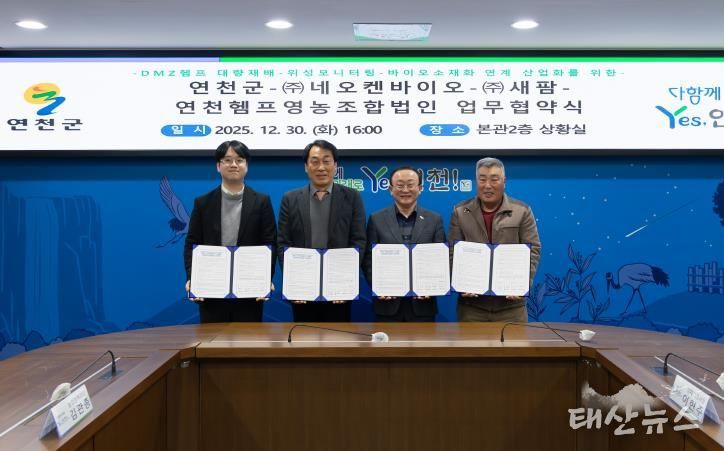 태산뉴스 이동욱 기자 | 연천군은 지난 30일 연천군청 본관 2층 상황실에서 ㈜네오켄바이오, ㈜새팜, 연천헴프영농조합법인과 함께 DMZ 지역 헴프(대마) 산업의 체계적 육성과 산업화를 위한 업무협약을 체결했다.