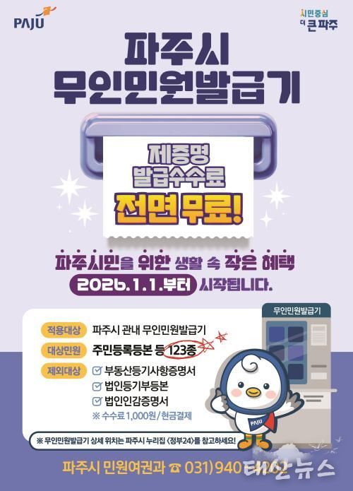 태산뉴스 이동욱 기자 | 파주시는 시민들의 비용 부담을 줄이고 생활 편의를 높이기 위해 2026년 1월 1일부터 관내 무인민원발급기에서 발급되는 제증명 수수료를 전면 무료화한다고 밝혔다.