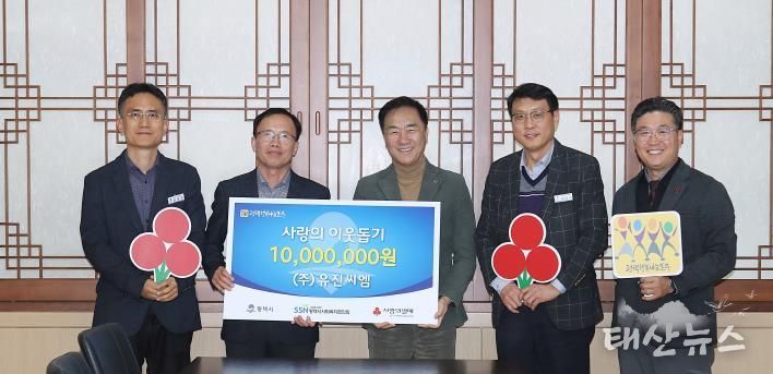태산뉴스 이동욱 기자 | (주)유진씨엠은 지난 29일 평택시청 대외협력실에서 평택행복나눔본부에 이웃돕기 성금 1,000만원을 전달했다.