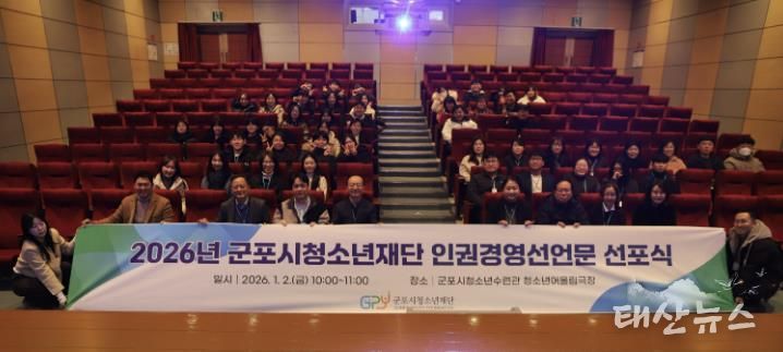 시무식에서는 김덕희 대표이사의 신년 인사말씀을 시작으로, 재단의 경영 철학과 가치 실현 의지를 담은 군포시청소년재단 인권·경영 선언문 선포식이 진행됐다. 이를 통해 재단은 인권 존중을 기반으로 한 책임 있는 경영과 청소년 중심의 공공기관 운영 의지를 공식화했다.