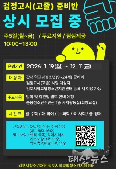 태산뉴스 이동욱 기자 | 김포시청소년재단 학교밖청소년지원센터에서는 1월 19일부터 관내 학교밖청소년들이 고등학교 졸업 자격을 취득할 수 있도록 하는 고졸 검정고시 학습지원을 시작한다고 밝혔다. 검정고시 학습지원 프로그램 희망교실은 학교밖청소년들에게 교육 기회를 제공하여 사회구성원으로서 성장할 수 있는 디딤돌 역할을 해 줄 것으로 기대한다.