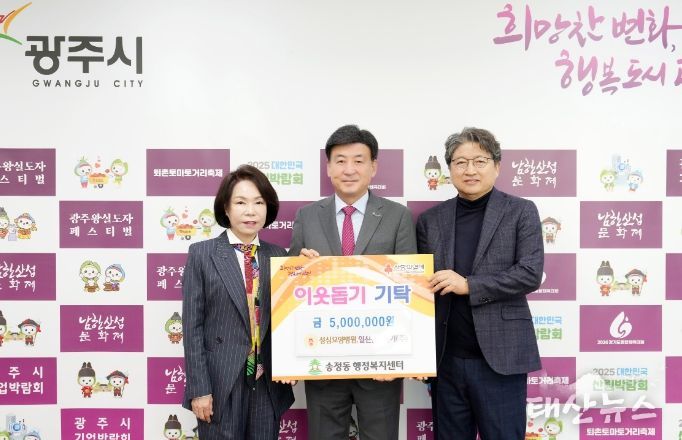 태산뉴스 이동욱 기자 | 성심요양병원 유미하 이사장과 일신산업전기(주) 고수영 대표는 8일 광주시 송정동에 이웃돕기 성금 500만 원을 기탁했다.