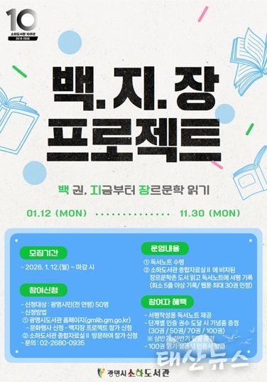 태산뉴스 이동욱 기자 | 광명시 소하도서관은 오는 12일부터 장르문학 도서 100권 읽기 챌린지인 ‘백.지.장 프로젝트’ 참여자를 모집한다.