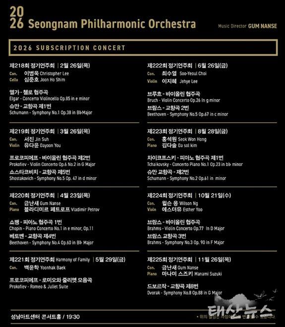 태산뉴스 이동욱 기자 | 2026년 창단 23주년을 맞는 성남시립교향악단은 해마다 다양한 연주자와 수준높은 프로그램으로 끊임없이 매진 행렬을 이어가고 있다.